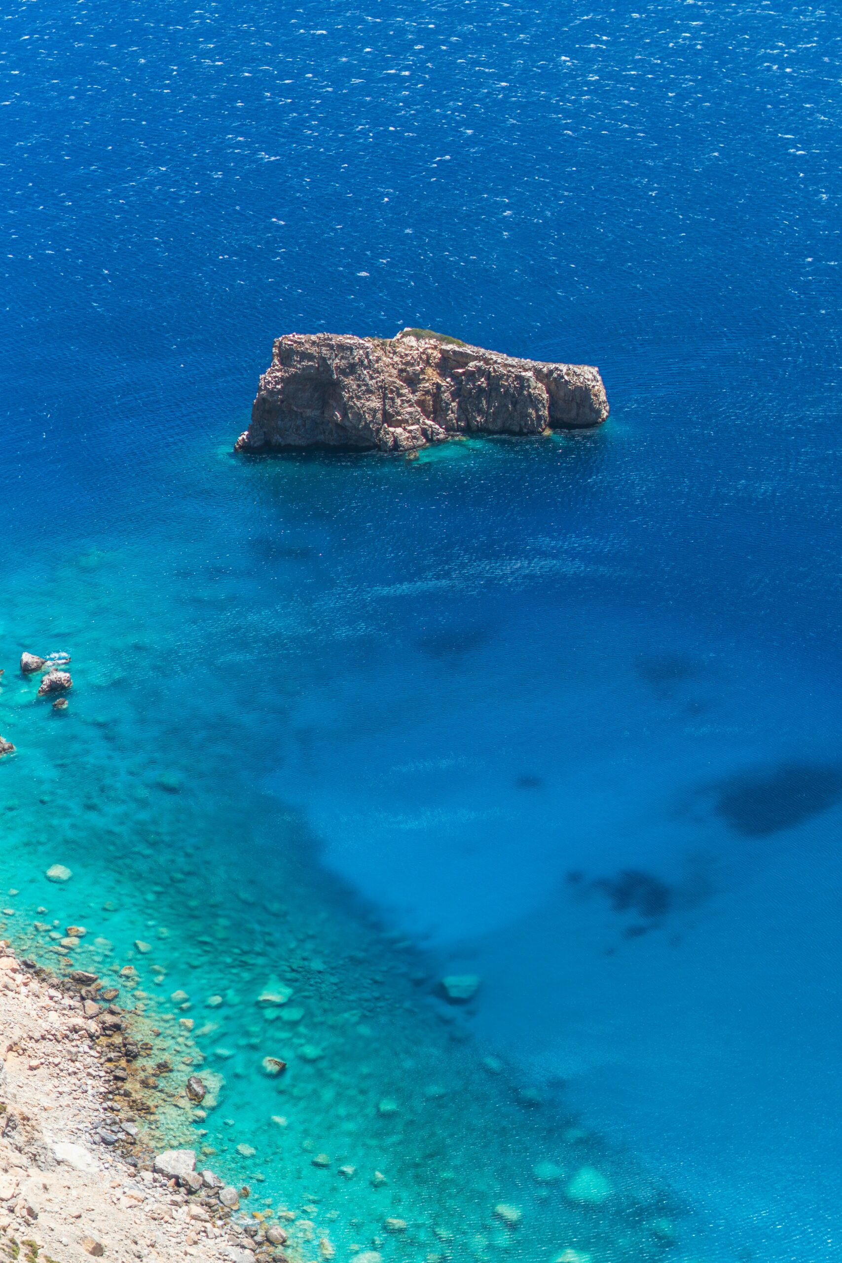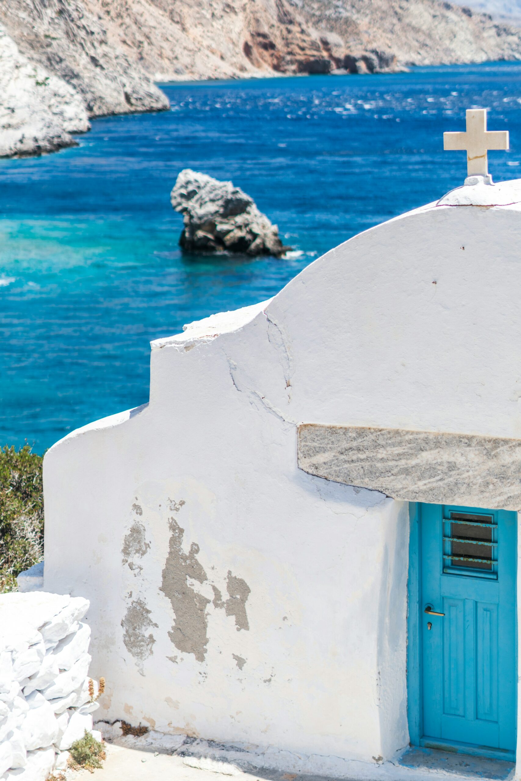 Juste en dessous du monastère, c’est LA crique du Grand Bleu. L’eau y est d’une clarté irréelle et devient très vite profonde (d’où cette couleur bleu marine intense). C’est une toute petite plage de galets et de rochers, dominée par une minuscule chapelle blanche.