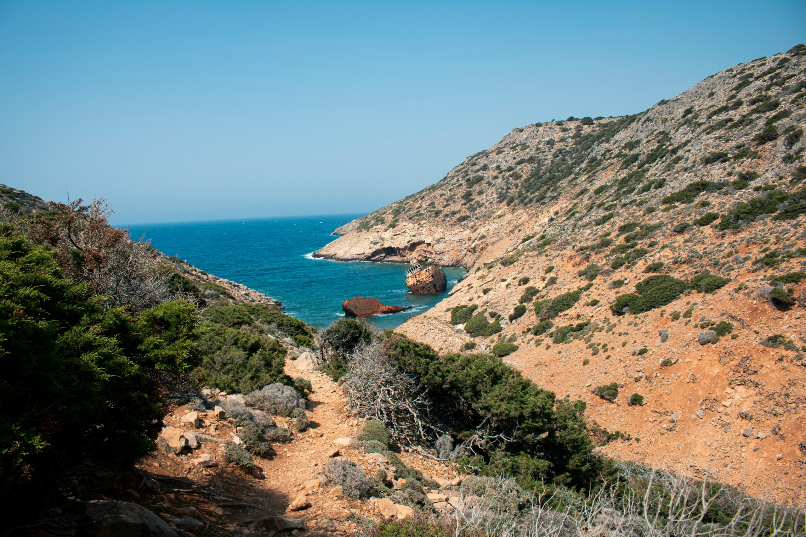 Dans la baie de Liveros, au sud-ouest, gît la carcasse rouillée du navire « Olympia », échoué là depuis 1980. L’ambiance y est fantomatique et photogénique. Le contraste entre la rouille orangée, la mer turquoise et le ciel est saisissant.