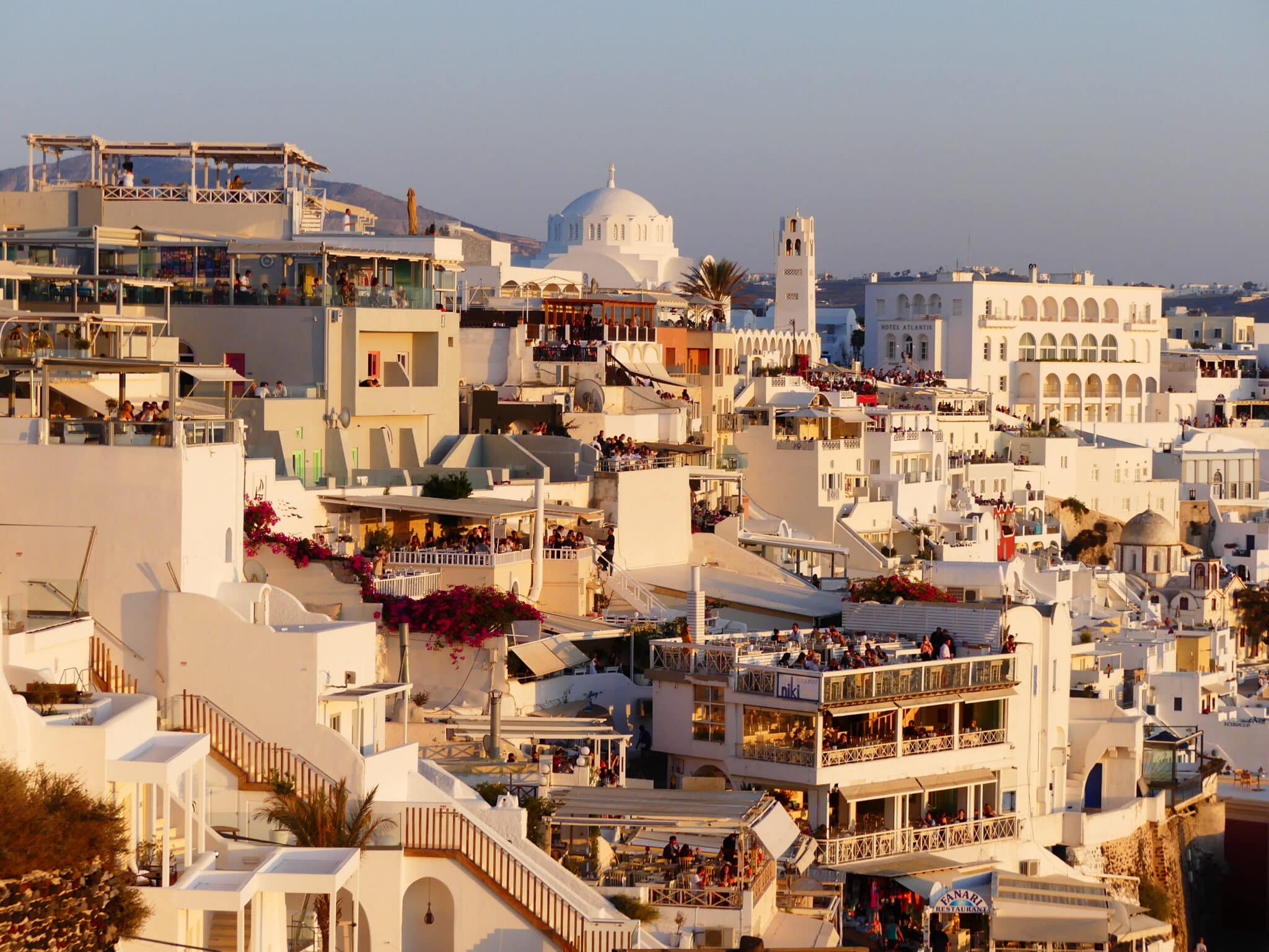 Oia s’est imposée comme la capitale mondiale du coucher de soleil à Santorin — et ce n’est pas usurpé. Mais Fira offre un spectacle tout aussi magnifique, dans une atmosphère bien moins bondée. En fin d’après-midi, les façades blanches virent à l’or pâle, et la caldeira scintille sous les derniers rayons.