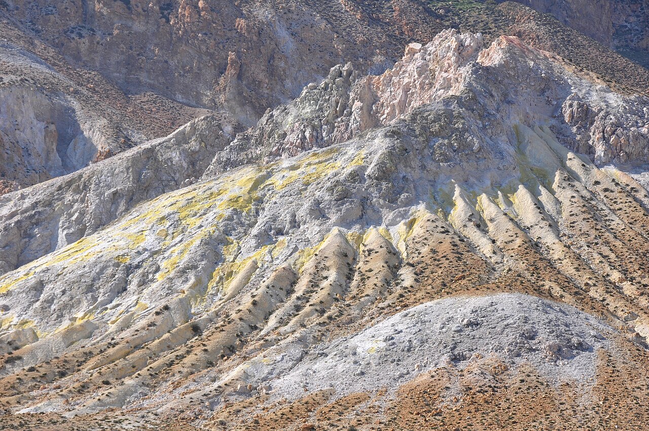 Nisyros est l’un des rares endroits au monde où l’on peut marcher à l’intérieur d’un volcan actif. Le cratère Stefanos, au fond de la caldeira, mesure 330 mètres de diamètre et 27 mètres de profondeur. Le sol jaune de soufre craque sous les pieds, des fumerolles sifflent en s’échappant des failles, et des marmites de boue bouillonnante rappellent que la chambre magmatique est toujours active quelques kilomètres plus bas.