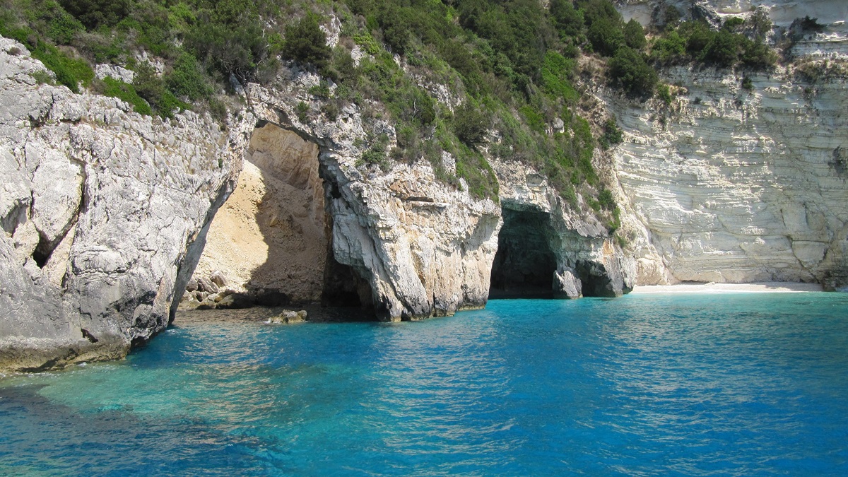 La côte ouest de Paxos est un mur de falaises blanches de calcaire, sculptées par l’érosion en arches, dômes et cavités marines. Les grottes bleues (Blue Caves) sont le spectacle majeur de l’île : la lumière du soleil filtre à travers les ouvertures et se reflète sur le fond calcaire, créant une luminescence turquoise surnaturelle. Certaines grottes sont assez vastes pour y entrer en bateau.