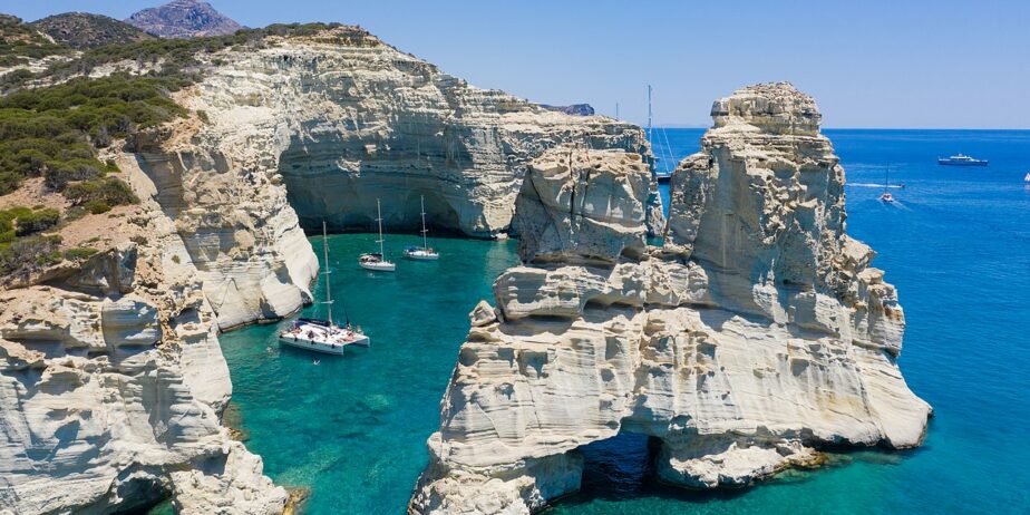 Le départ s’effectue depuis le port d’Adamas. Le navire met le cap vers l’Ouest pour rejoindre l’emblématique baie de Kleftiko. Sur place, vous profitez d’une heure de baignade entre les arches de pierre blanche. Le périple se poursuit vers la grotte de Sykia, sanctuaire à ciel ouvert. Ensuite, le bateau rapide jetera l’ancre dans les eaux émeraude de la baie de Kalogries (ou Agathia) pour une pause détente. Sur le chemin du retour, le rythme ralentit devant le Cap Vani et ses anciennes mines. Admirez ensuite la vue devant le village de Klima, célèbre pour ses sirmata (maisons de pêcheurs) aux couleurs vives. Note : En cas de vents du nord, un itinéraire abrité le long de la côte sud (Gerakas, Tsigrado) est proposé pour garantir votre confort.