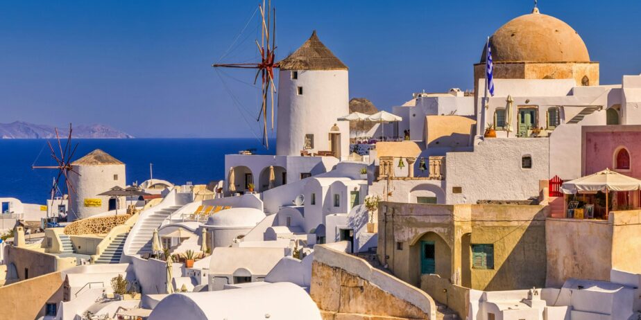 Accès aux points de vue panoramiques sur la caldeira et l’architecture traditionnelle des Cyclades.