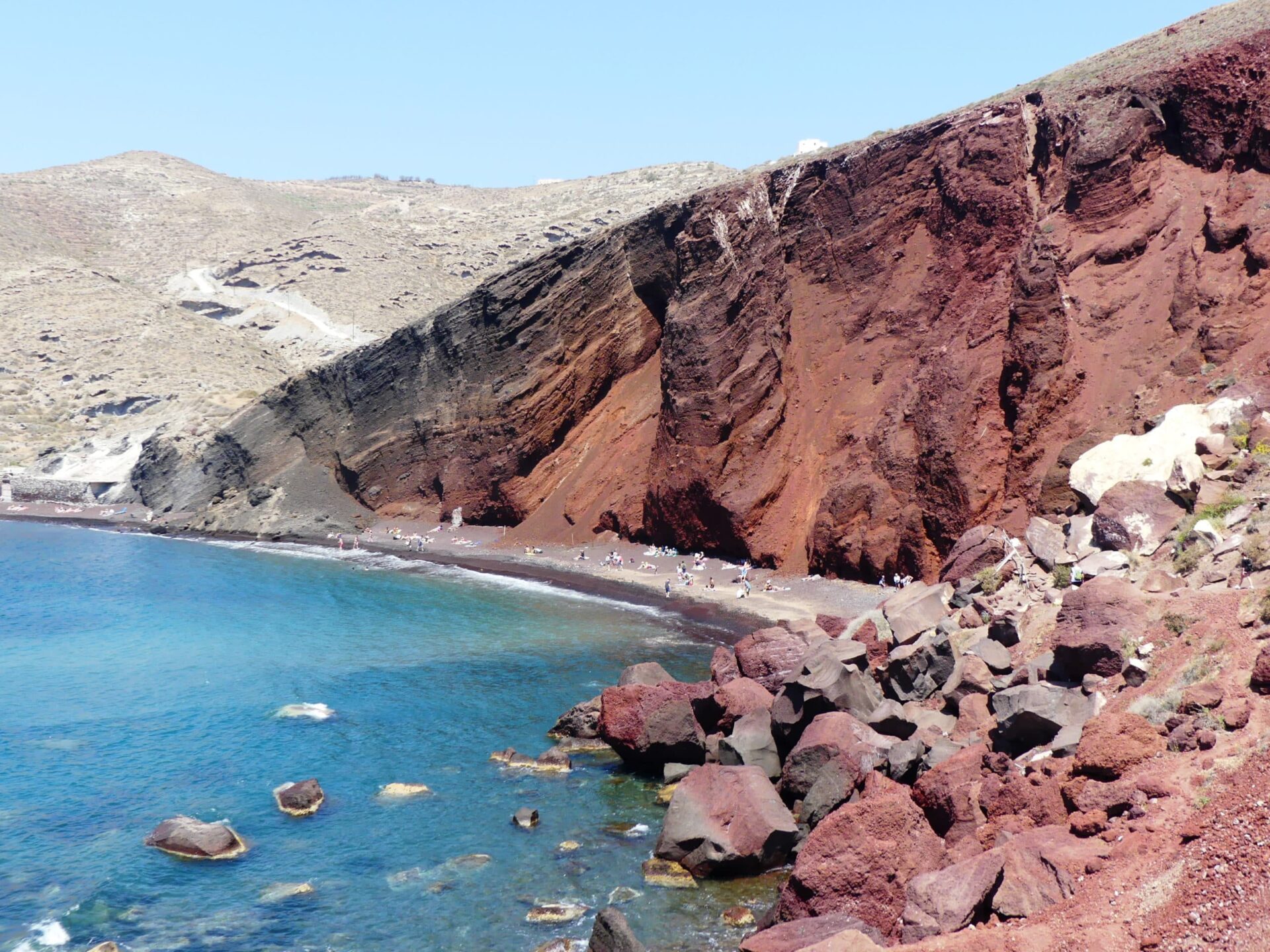 Sur la côte est de Santorin, cette station balnéaire est célèbre pour sa longue plage de sable noir volcanique.